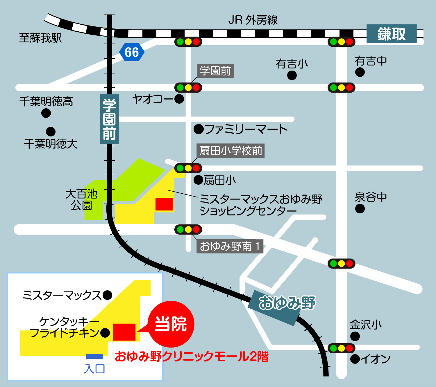 駐車場多数完備で買い物にも便利なミスターマックスおゆみ野ショッピングセンター内にあります(ミスターマックス正面、ケンタッキー横です)。おゆみのクリニックモール2階です。
